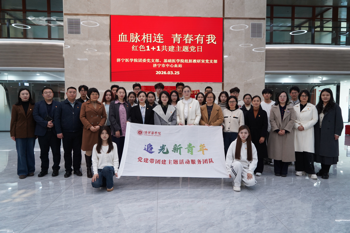 3月25日,学校团委党支部、组织学与胚胎学教研室党支部联合济宁市中心血站,共同开展“血脉相连,青春有我”红色“1+1”共建主题党日活动。来自2025级临床医学、医学影像学、法医学、精神医学、预防医学等专业的20余名团员青年代表参与活动。