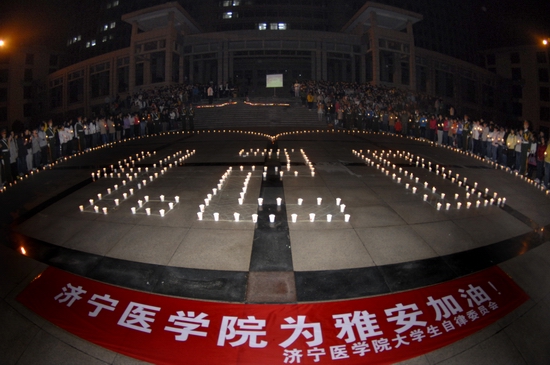4月23日晚7:30,济医“心系雅安”祈福活动在日照校区主楼前广场举行,近千名济医学子点燃蜡烛,深切