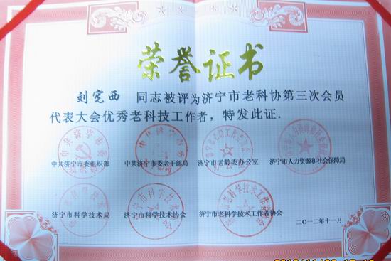 近日,刘宪西同志被中共济宁市委组织部、中共济宁市委老干部局、济宁市人力资源和社会保障局等部门评为济宁