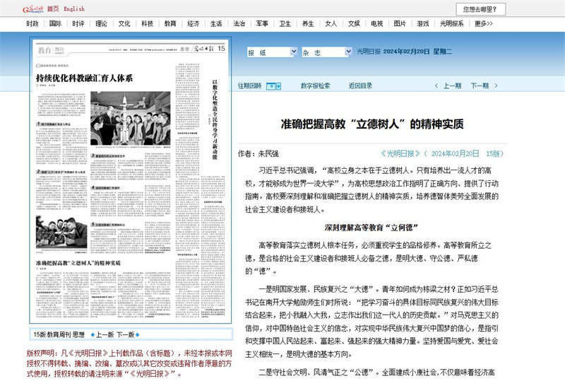 2月20日,《光明日报》刊发马克思主义学院教师朱民强的文章《准确把握高教“立德树人”的精神实质》。文章表示,高校教育的“立德”就是要明大德、守公德、严私德,“树人”就是要培养具有家国情怀、视野宽广、敢于担当的时代新人,勇于接好历史和时代的“接力棒”。原文如下:准确把握高教“立德树人”的精神实质习近平总书记强调,“高校立身之本在于立德树人。只有培养出一流人才的高校,才能够成为世界一流大学”,为高校思想政治工作指明了正确方向、提供了行动指南。高校要深刻理解和准确把握立德树人的精神实质,培养德智体美劳全面发展的社会主义建设者和接班人。深刻理解高等教育“立何德”高等教育落实立德树人根本任务,必须重视学生的品格修养。高等教育所立之德,是合格的社会主义建设者和接班人必备之德,是明大德、守公德、严私德的“德”。一是明国家发展、民族复兴之“大德”。青年如何成为栋梁之材?正如习近平总书记在南开大学勉励师生们时所说:“把学习奋斗的具体目标同民族复兴的伟大目标结合起来,把小我融入大我,立志作出我们这一代人的历史贡献。”对马克思主义的信仰,对中国特色社会主义的信念,对实现中华民族伟大复兴中国梦的信心,是指引和