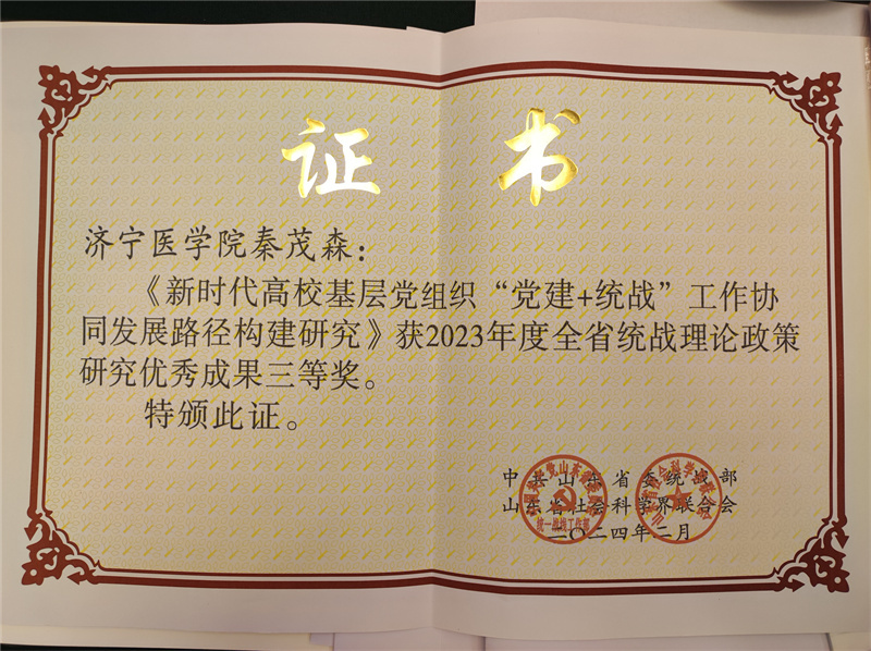 2月3日,全省统战部长会议在济南召开。会议通报了2023年度全省统战理论政策研究优秀成果,由校党委统战部推送的马克思主义学院党委副书记、副院长秦茂森撰写的《新时代高校基层党组织“党建+统战”工作协同发展路径构建研究》课题论文被省委统战部、省社会科学界联合会评为2023年度全省统战理论政策研究优秀成果三等奖。近年来,学校深入学习贯彻习近平总书记关于做好新时代党的统一战线工作的重要思想,将统战理论研究工作作为提高统战意识、宣传统战政策、推动统战工作、扩大统战影响的重要抓手,摆在学校统战工作突出位置,坚持围绕中心,服务大局,注重思想政治引领、强化队伍建设、积极搭建平台、支持岗位建功,确保统战理论研究工作落到实处,凝练工作特色和理论经验,有力提升了全校统战工作质量,形成了一批具有鲜明特色的理论创新和实践创新成果。【信息来源:统战部 撰稿:高启达 责编:蒲丽娜 终审:苗冠群】