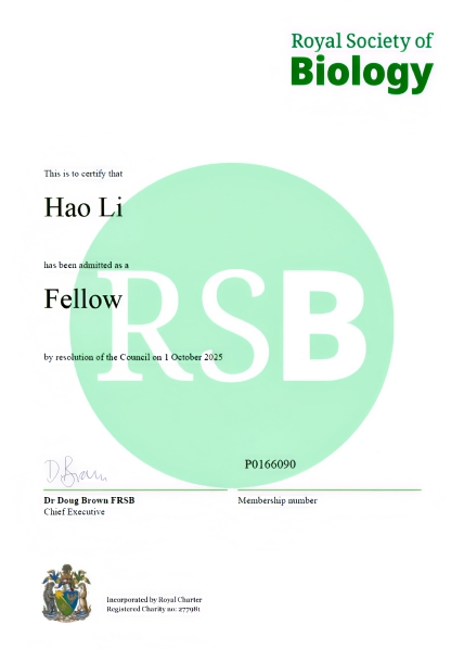 近日,我校公共卫生学院李灏教授入选2025年度英国皇家生物学会会士(Fellow of the Royal Society of Biology,FRSB)。据悉,英国皇家生物学会致力于推动与生命科学相关的教育及学术活动、业界发展及生物科技研发,是全球具有重大影响力的生物学组织之一,汇聚各地出色的科学家和研究人员,其由多个著名专业学会和学术组织共同组成,是英国皇家特许权威学术组织。英国皇家生物学会会士主要经国际知名科学家推荐、会士委员会选举以及英国皇家生物学会批准,是对科学家个人在生物科学领域取得卓越成就和重大贡献得到全球性的高度认可。【信息来源:公共卫生学院撰稿:刘燕责编:蒲丽娜终审:张秋生】