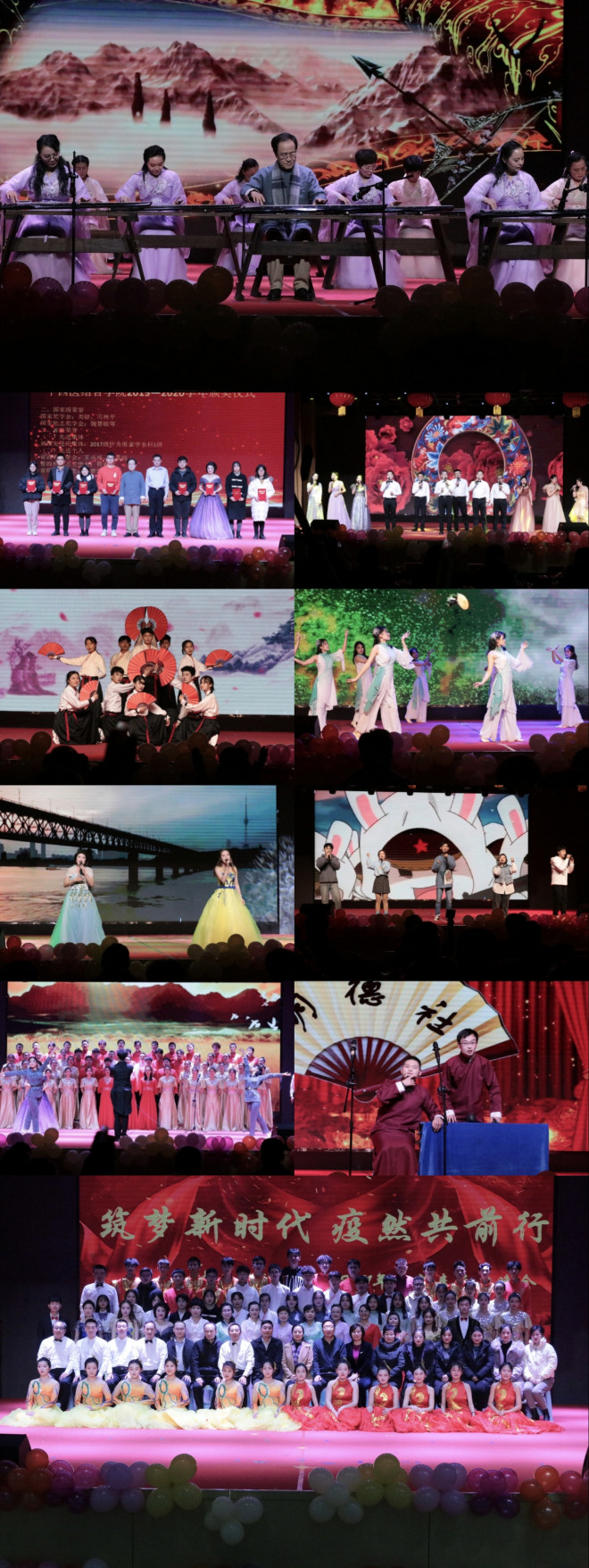 12月23日晚,中西医结合学院举办“筑梦新时代,疫然共前行”2021年迎新春元旦晚会。学校原党委委员、原副院长司传平,校团委副书记刘瑞文观看晚会。晚会分为“继往开来,薪火相传”“无惧风雨,疫往直前”“筑梦启航,共赴韶华”三个篇章,舞蹈《盛世花开》拉开晚会序幕。太极武术表演《中国功夫》、相声《百变神医》、民族舞《烟雨行舟》、古琴表演《良宵引》《关山月》,等节目,彰显了中华优秀传统文化魅力;歌曲串烧《唱响青春》、现代舞《沧海一声笑》展现了青年学子的青春活力,表达了积极奋进、昂扬向上的决心与斗志;原创诵读《战疫》、女生二重唱《你要相信这不是最后一天》、小品《乌龙快递》等节目,赞颂了新冠肺炎疫情期间全国人民齐心协力、共克时艰的爱国精神;教师小合唱《相亲相爱一家人》、歌伴舞《天耀中华》讴歌了全国各族人民砥砺奋进、共筑中国梦的精神。晚会在《我的祖国》《微山湖上弹起我的土琵琶》的师生合唱中落幕。中西医结合学院领导班子成员、全体教师和2020级学生400余人观看晚会。晚会同时开放微信上墙、直播通道等多种参与方式,其中微博直播点击量高达1.2万次。【信息来源:中西医结合学院 撰稿:刘擎 责编:苗冠群】