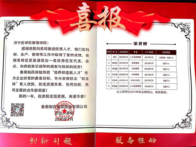 5月29日,鲁南制药集团股份有限公司送来喜报,我校管理学院人力资源管理专业毕业生李乐获鲁南制药集团股份有限公司2019年“二级功勋”“先进个人”称号,市场营销等专业毕业生步长鹏等5名同学获鲁南制药集团股份有限公司“先进个人”“标兵个人”称号。鲁南制药集团是集中药、化学药品、生物制品的生产、科研、销售于一体的综合制药集团,国家创新型企业、国家火炬计划重点高新技术企业。管理学院市场营销、公共事业管理、劳动与社会保障、人力资源管理等多个专业的十多名本专科毕业生在鲁南制药集团多个岗位就职,多人多次获集团公司嘉奖,得到了集团的高度认可。近年来,管理学院不断探索人才培养新模式,采取“走出去、请进来”等多种形式,多领域拓宽就业渠道、全方位开辟就业市场,构建调研信息反馈机制,开展回访和追踪调查,制定就业指导和服务工作机制,提升就业指导和服务水平,实现更高质量更加充分就业的目标,努力为社会培养出更多素质高、能力强的复合型人才。【信息来源:管理学院 撰稿:刘会 责编:苗冠群】